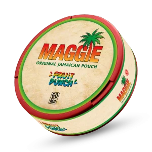 Experience Maggie Fruit Punch (60mg), an ultra-strong, tobacco-free nicotine pouch delivering a bold 60mg kick with a juicy tropical fruit punch burst, long-lasting flavor, and discreet all-day satisfaction—perfect for fans of strong snus seeking premium intensity and taste.